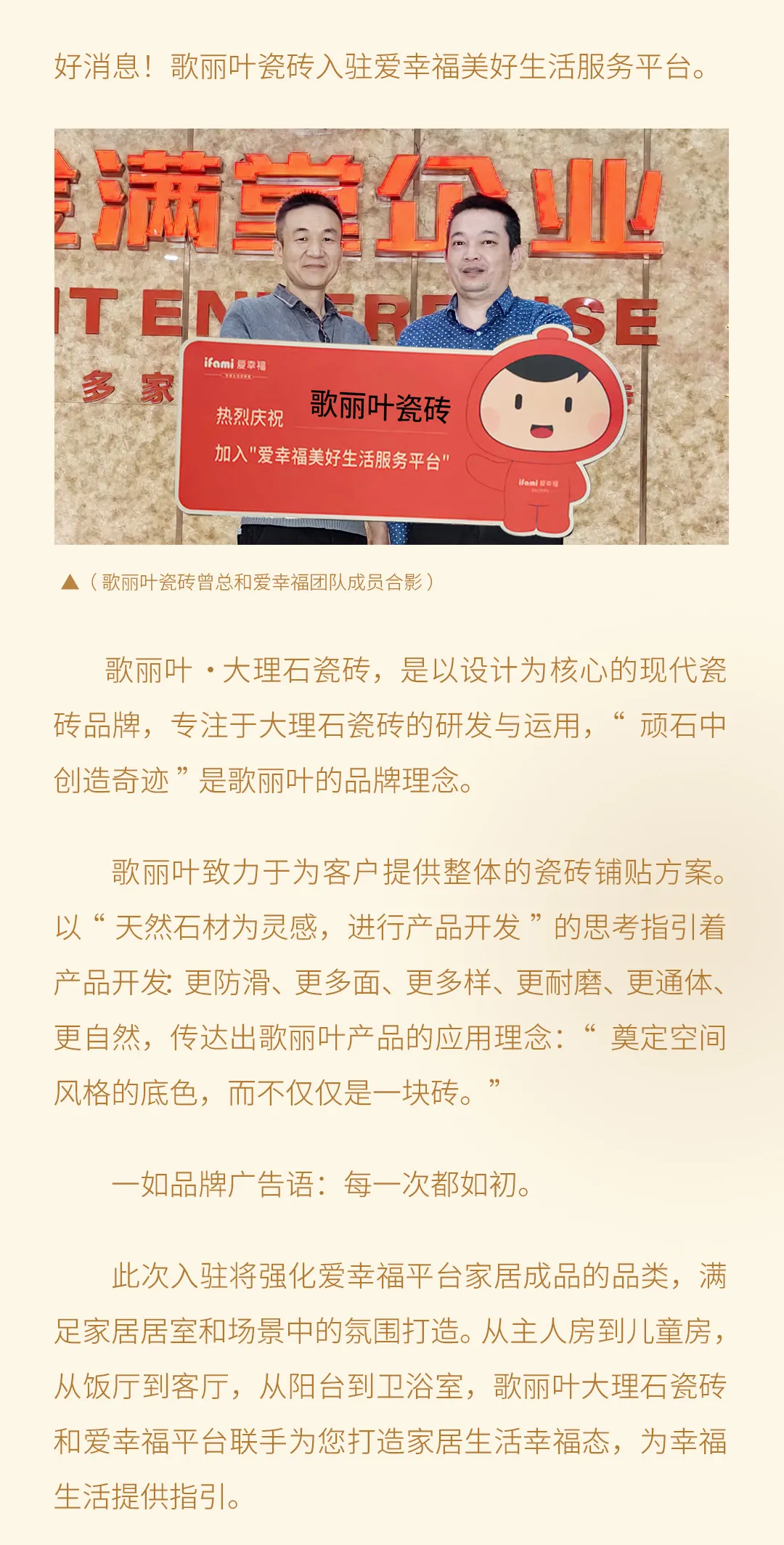 歌丽叶瓷砖正式入驻爱幸福·美好生活服务平台