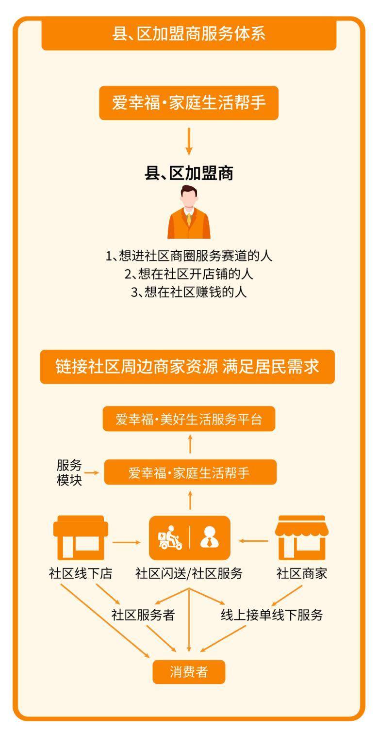 抢占社区商圈C位,独享社区服务刚需赛道;爱幸福县区招商,线上平台划区域独家保护,线下门店定商圈,双渠道模式独享本地收益!