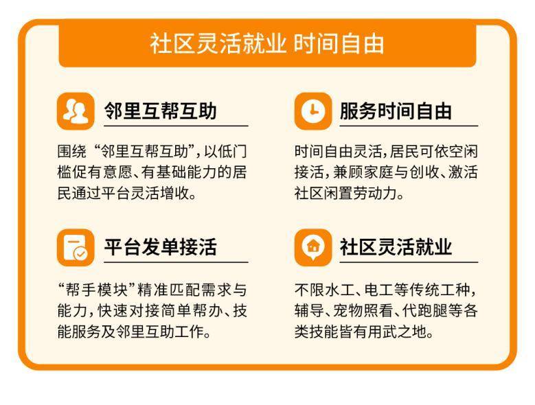 3. 以 “邻里互帮互助” 为核心,降低就业门槛,让有服务意愿、有基础能力的居民都能通过平台实现灵活增收。