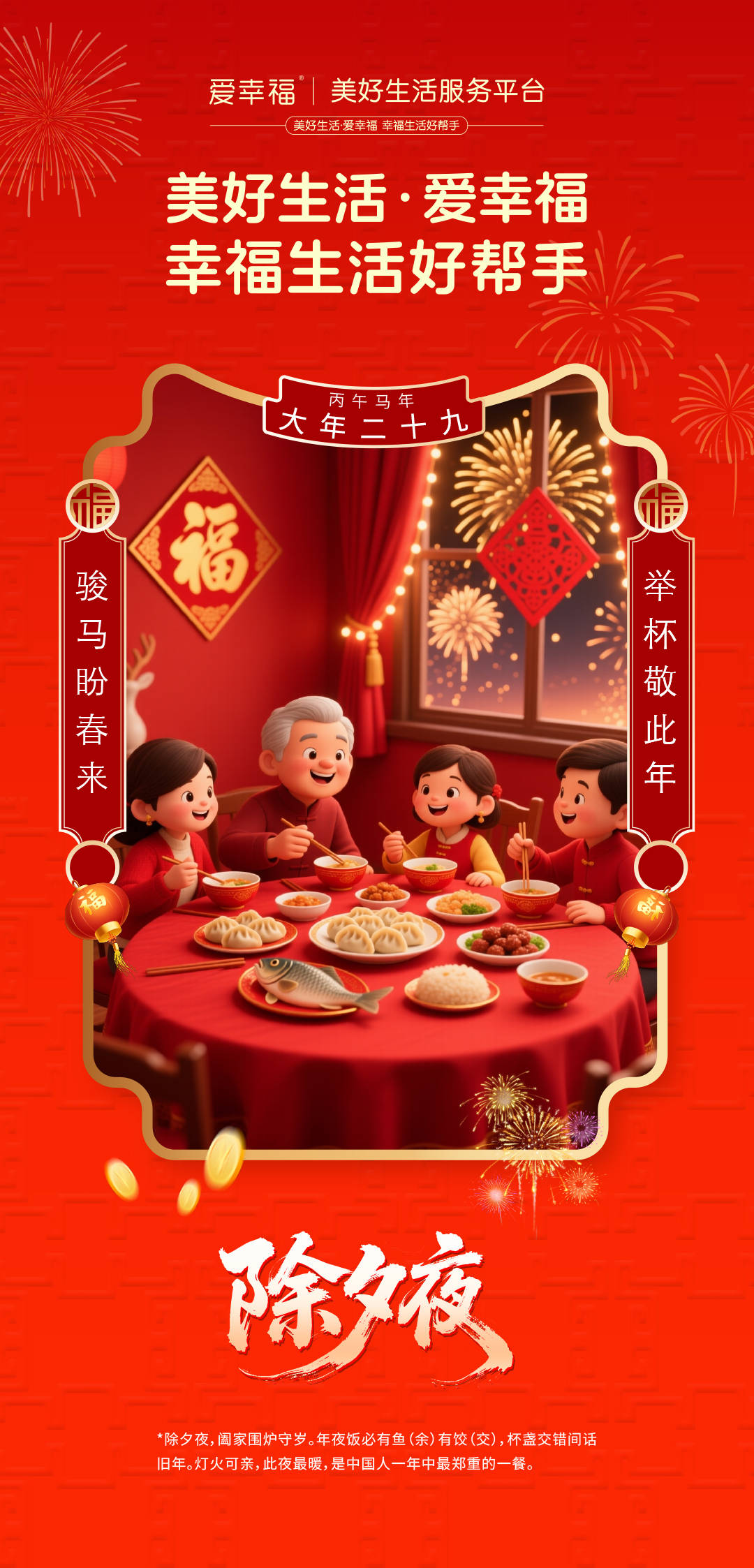 今夜,华灯初上,烟火璀璨。爱幸福将继续秉承“为爱而生”的理念,让幸福的种子在社区的每个角落生根发芽。祈愿新的一年,爱幸福能始终陪伴左右,做您生活的好帮手,让寻常日子,洋溢不寻常的温暖;让归家团圆之时,总有灯火可亲的安心。